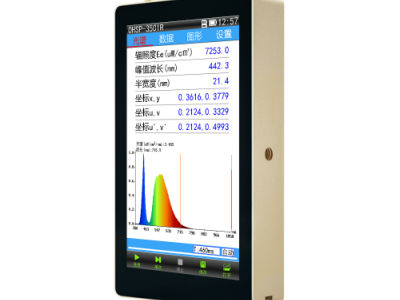 OHSP-350IR集光谱、照度、色温、显色指数、R9、波长、辐照度、色坐标、色容差、等测量功能参数于一体。采用5英寸大屏,各测量参数及曲线实时显示,使用方便快捷。专用于测量红光及红外光波段的辐照度和波长的测量,用于红光治疗、红外夜视监控、红外遥控发射管、红外激光等的测量。