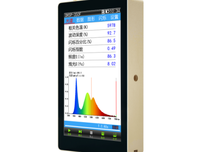 350F集光谱、照度、色温、显色指数、R9、波长、辐照度、 色坐标、色容差、等测量功能参数于一体。 采用5英寸大屏 ,各测量参数及曲线实时显示 ,使用 方便快捷。可测量LED等宽光谱光源、也可以测量 家用和商用照明灯具、护眼台灯、教室灯具、高低 压钠灯HID等窄光谱的光源。