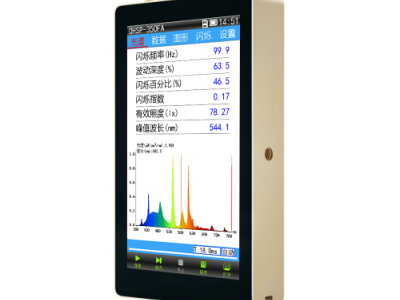 OHSP-350FA集光谱、照度、有效照度、有效光强、闪光时间、峰值照度、 色温、显色指数、频闪、R9、波长、辐照度、色坐标、色容 差、等测量功能参数于一体。采用5英寸大屏,各测量参数及曲线实时显示,使用方便快捷。 可测量手机闪光灯、相机闪光灯、航空障碍灯、应急闪光灯、 激光脱毛仪(定制)、氙气闪光灯等,采用同步触发采样技 术,200kHz高速采样,专用于闪光 灯的瞬时光照度及光谱的测试