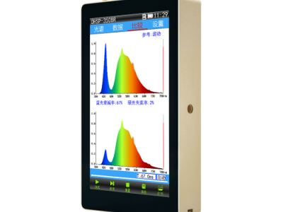 350BR蓝光光谱检测仪是在精华版的基础上增加对比测试功能,OHSP-350BR集光谱比较、蓝光衰减率、绿光失真率、照度、色温、 显色指数、R9、波长、辐照度、色坐标、色容差、等测量功能参数于一体,采用5英寸大屏,各测量参数及曲线实时显示,使用 方便快捷。可测量LED等宽光谱光源、也可以测量防 蓝光眼镜或者其他防蓝光产品的对比测试,图形和文 字方式直观反应产品的抗蓝光效果。